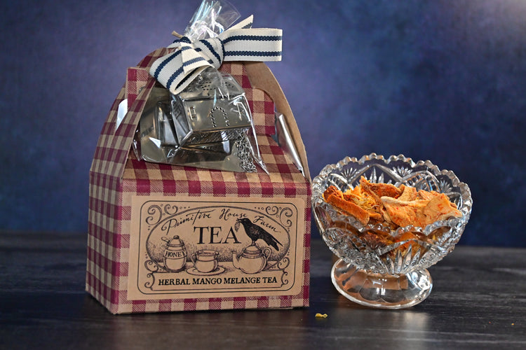 Herbal Mango Mélange Tea- Pineapple cubes, mango cubes, pineapple and mango flakes, orange slices, tangerine pieces, safflower, marigold blossoms, strawberries, natural flavors