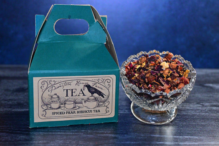 Spiced Pear Hibiscus Tea- apple pieces, hibiscus blossoms, rosehips, pineapple cubes, cinnamon pieces, sunflower blossoms and natural flavorings