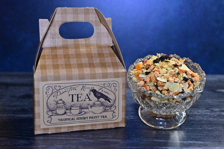 Tropical Sunset Fruit Tea-coconut flakes, mango, apple hibiscus, banana chips, strawberry, sandy everlasting flower and natural flavors