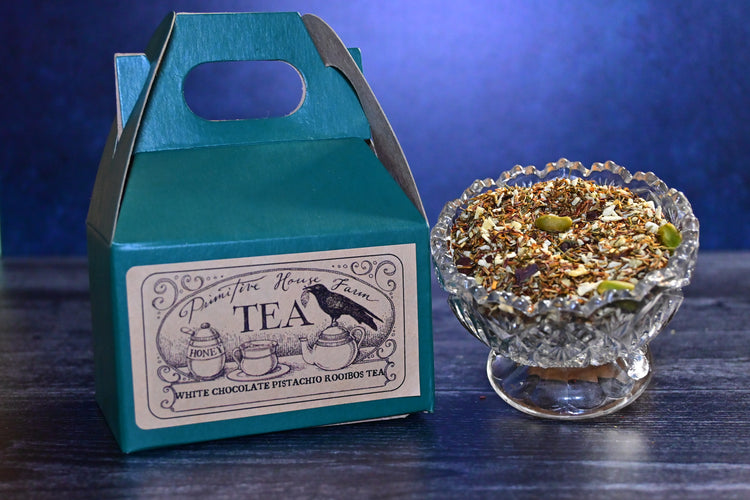 White Chocolate and Rooibos Tea- green rooibos, coconut flakes, white chocolate chips, pistachios, cocoa peel and natural flavorings