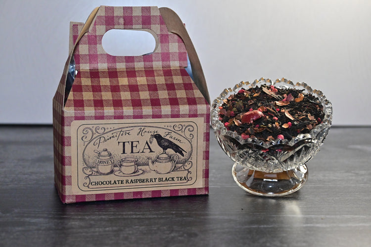 Chocolate Raspberry Black Tea- black tea, cocoa bits, raspberries, cinnamon pieces, blackberry and blueberry leaves and natural flavors