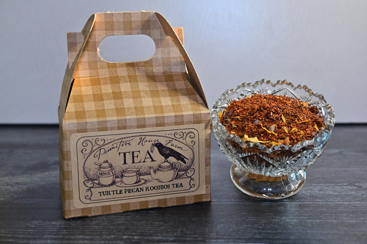 Turtle Pecan Rooibos- green rooibos, apple pieces, cocoa nibs, cinnamon, dark chocolate chips, chicory, marigold flowers and natural flavorings
